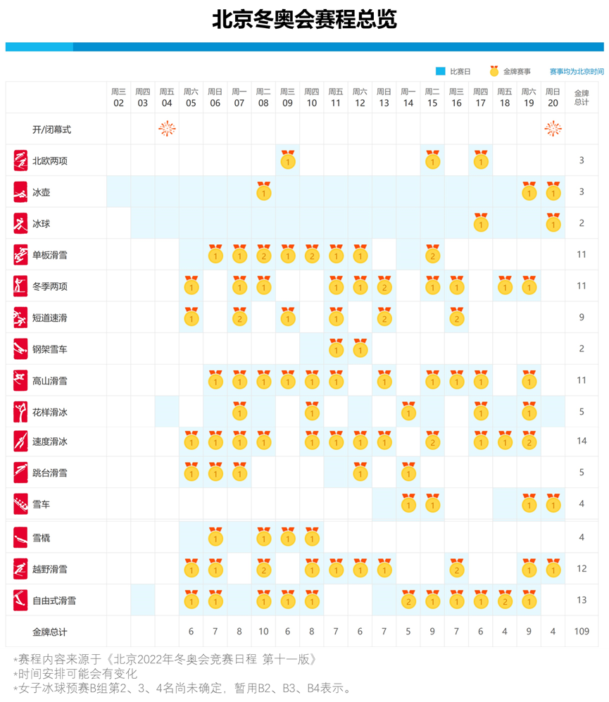 北京冬奥会从2022年2月2日开始至20日,将有19个比赛日。我们共同期待着中国健儿在北京2022年冬奥会的精彩表现。