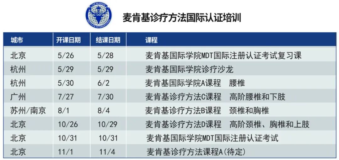2020年被疫情打断的计划,终于要在今年重启了,国内首次麦肯基力学诊疗方法国际注册认证考试将于2024年的金秋十月在北京举办。