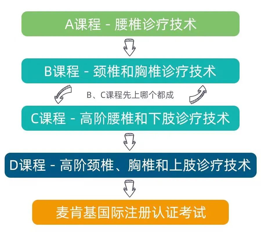 取得A、B、C、D四门课程证书的学员,有资格参加麦肯基国际学院(THEMCKENZIE INSTITUTE INTERNATIONAL®)开设的注册认证考试,通过考试后可以取得麦肯基国际学院全球注册的Credentialled MDT称号(Mechanical Diagnosis and Therapy®),拥有该称号的临床工作者的个人信息将被收录至麦肯基国际学院官方网站的注册名录中,并可以选择继续参加麦肯基国际学院开设的力学诊疗文凭课程Dip. MDT(The Diploma in Mechanical Diagnosisand Therapy®)。