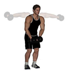 动作要领:身体直立,双手各持一只哑铃,双臂在身前自然下垂。将哑铃紧贴身体向上高拉,肘部向身体两侧打开,直至肘部与肩关节平齐,在最高点稍停留,缓慢放下。每10-12次为一组,重复2-3组。