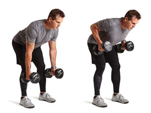动作要领:双手自然下垂持哑铃,膝盖、髋部屈曲,上身前倾,臀部向后,保持背部挺直。肩部、上背部发力,肘部贴近身体,将哑铃快速上提,在最高点稍停留,缓慢放下。每10-12次为一组,重复2-3组。